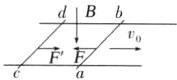 2.(多选)如图4所示,方向竖直向下的匀强磁场中有两根位于同一水平面内的足够长的平行金属导轨,两相同的光滑导体棒$ab$、$cd$静止在导轨上。$t = 0$时,棒$ab$以初速度$v_{0}$向右滑动。运动过程中,$ab$、$cd$始终与导轨垂直并接触良好,两者速度分别用$v_{1}$、$v_{2}$表示,回路中的电流用$I$表示。下列图像中可能正确的是( )