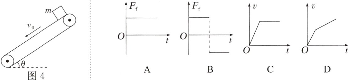 例4(多选)如图4所示,足够长的传送带与水平面夹角为θ,以速度v0逆时针匀速转动。在传送带的上端轻轻放置一个质量为m的小木块,小木块与传送带间的动摩擦因数μ < tanθ,则下列选项中能客观地反映小木块所受的摩擦力和运动情况的是( )