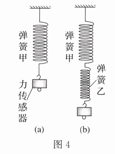 (1)由题中实验数据可知,弹簧甲每伸长2.00 cm,传感器示数约增加1 N,则弹簧甲的劲度系数k₁ = $\frac{\Delta F_{1}}{\Delta x}=\frac{1\ N}{0.02\ m}=50.0\ N/m$