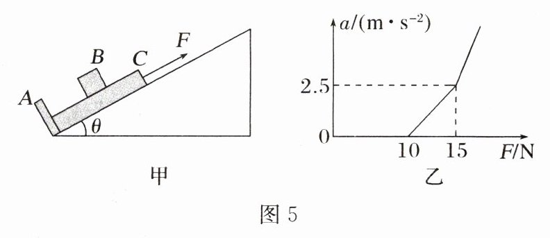 例2 (2024·江苏扬州模拟)如图5甲所示,光滑斜面上有固定挡板$A$,斜面上叠放着小物块$B$和薄木板$C$,木板下端位于挡板$A$处,整体处于静止状态。木板$C$受到逐渐增大的沿斜面向上的拉力$F$作用时,木板$C$的加速度$a$与拉力$F$的关系图像如图乙所示,已知最大静摩擦力等于滑动摩擦力,重力加速度$g = 10\ m/s^{2}$,则由图像可知下列说法正确的是 ( )