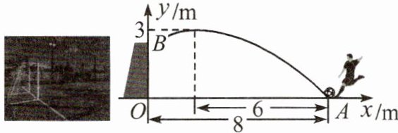 4.(2023·温州)一次足球训练中,小明从球门正前方 8 m 的 $ A $ 处射门,球射向球门的路线呈抛物线形. 当球飞行的水平距离为 6 m 时,球达到最高点,此时球离地面 3 m. 已知球门高 $ OB $ 为 2.44 m,现以 $ O $ 为原点建立如图所示的平面直角坐标系.