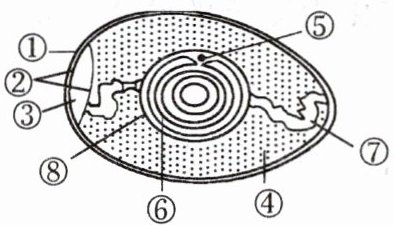 功能:①是______,具有保护和透气的作用。②是______,具有保护作用。③是______,贮存空气。④是______,为胚胎发育提供营养物质和水分。⑤是______,内含细胞核,是胚胎发育的部位。⑥是______,是主要的营养物质。⑦是______,固定卵黄。⑧是______,保护卵黄。