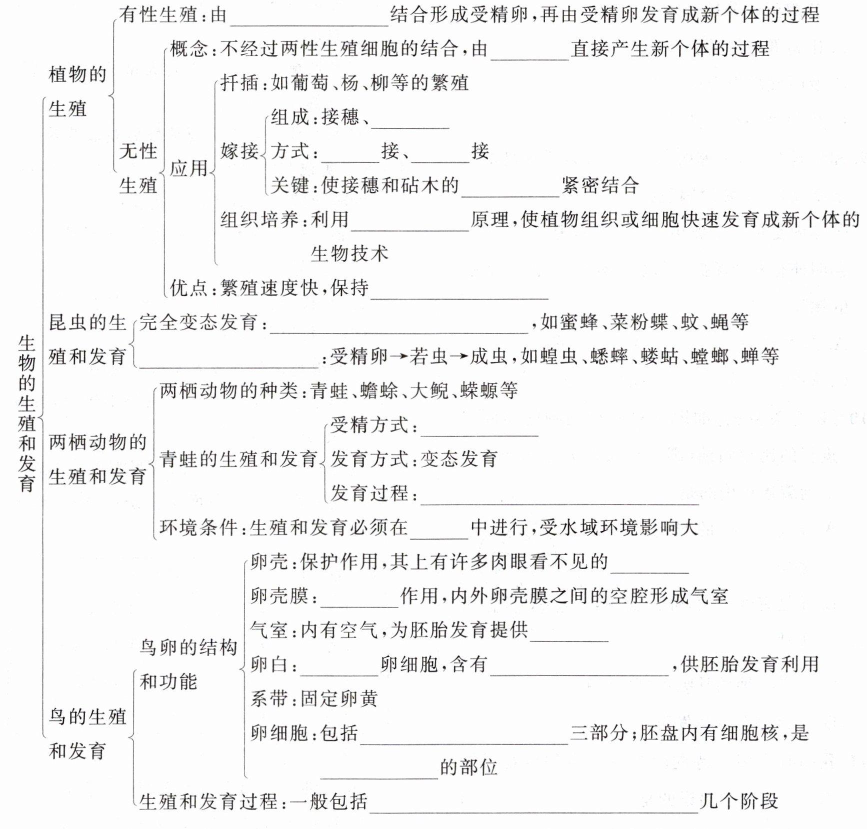两性生殖细胞@@母体@@砧木@@枝@@芽@@形成层@@无性生殖@@母体的优良性状@@受精卵→幼虫→蛹→成虫@@不完全变态发育@@体外受精@@受精卵→蝌蚪→幼蛙→成蛙@@水@@气孔@@保护@@氧气@@保护@@营养物质和水分@@卵黄膜、卵黄、胚盘@@胚胎发育@@求偶、交配、筑巢、产卵、孵卵和育雏