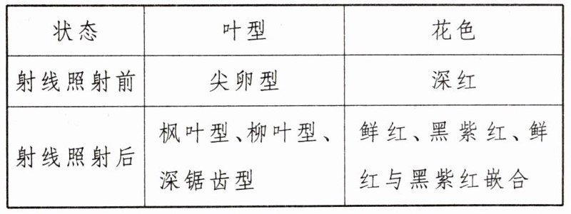 7. 研究人员用射线处理月季种子,从中选育出优质的新品种。射线照射前后植株的叶型和花色如下表。相关叙述正确的是 ( )