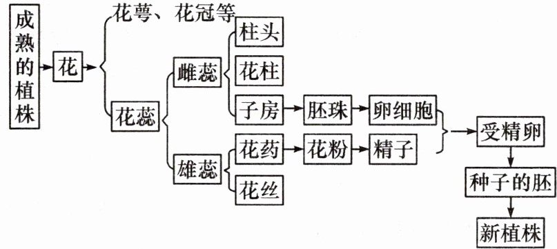 10. 被子植物是现代植物界中种类多、分布广、适应性强的一个类群。被子植物的一个显著特征是具有真正的花,所以被子植物又叫有花植物。绝大多数被子植物不仅可以进行有性生殖,还可以利用营养器官进行无性生殖。如图为被子植物有性生殖图解,请据图回答下列问题。