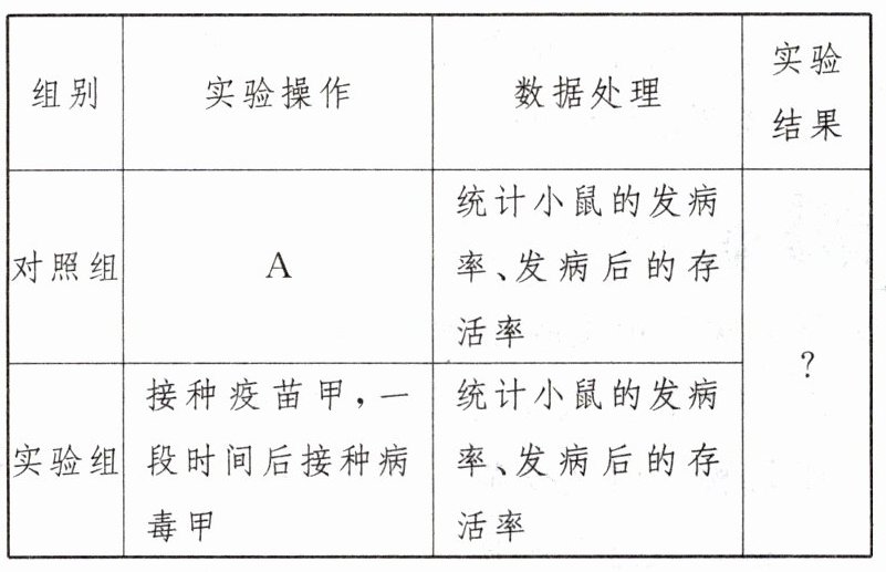 |实验组|接种疫苗甲,一段时间后接种病毒甲|统计小鼠的发病率、发病后的存活率| |