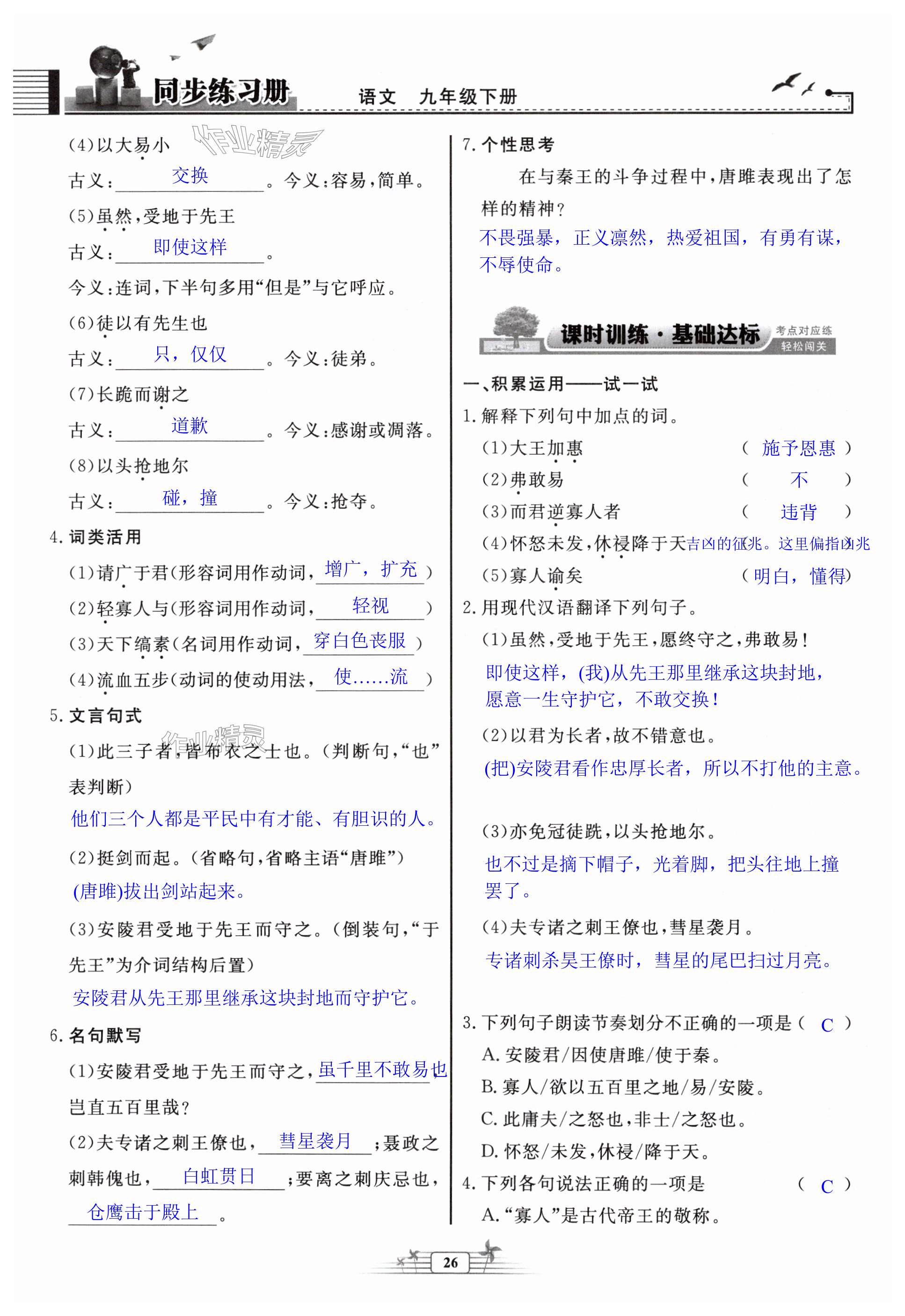 注:目前有些书本章节名称可能整理的还不是很完善,但都是按照顺序排列的,请同学们按照顺序仔细查找。练习册 2025年同步练习册人民教育出版社九年级语文下册人教版江苏专版 答案主要是用来给同学们做完题方便对答案用的,请勿直接抄袭。