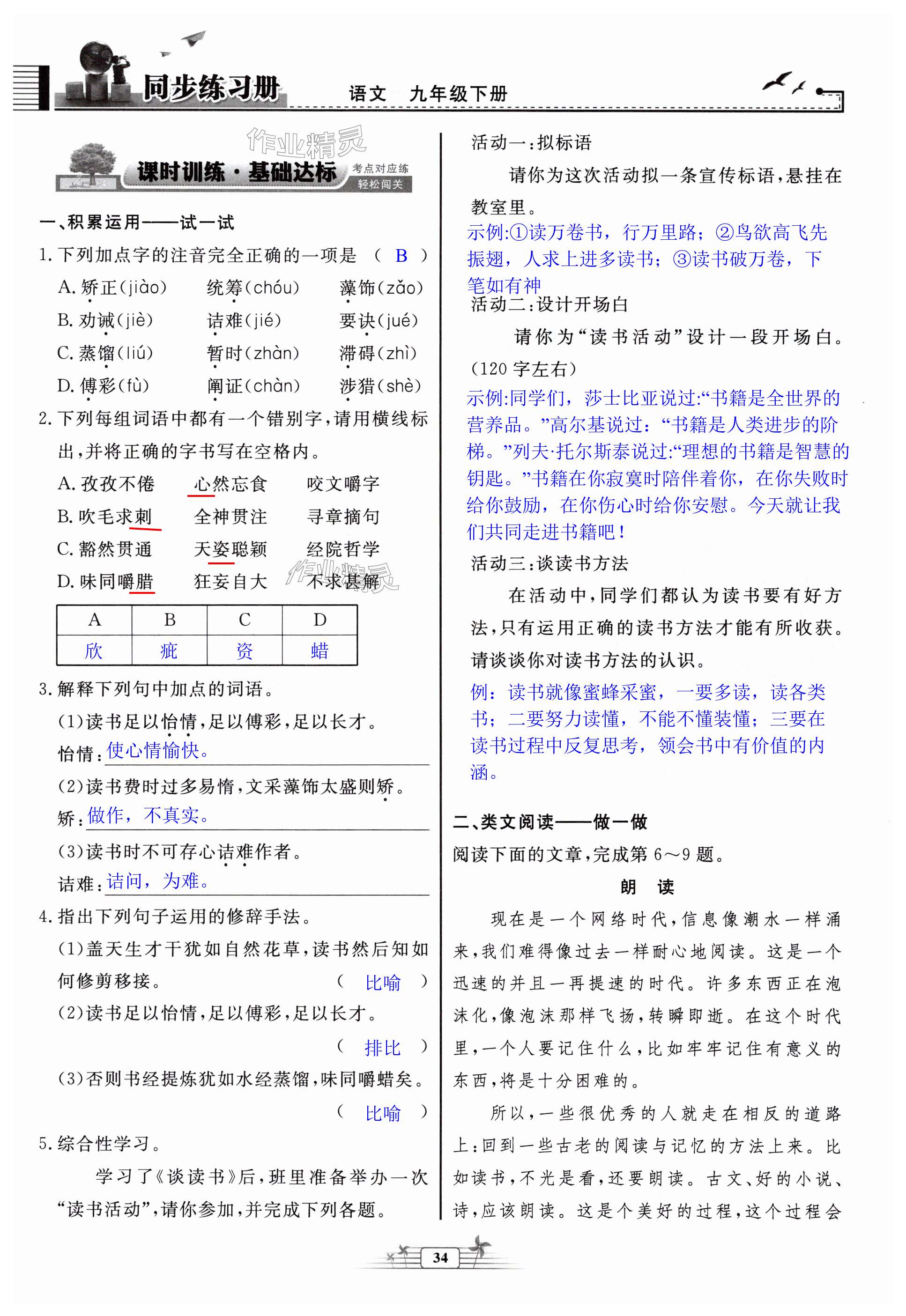 注:目前有些书本章节名称可能整理的还不是很完善,但都是按照顺序排列的,请同学们按照顺序仔细查找。练习册 2025年同步练习册人民教育出版社九年级语文下册人教版江苏专版 答案主要是用来给同学们做完题方便对答案用的,请勿直接抄袭。