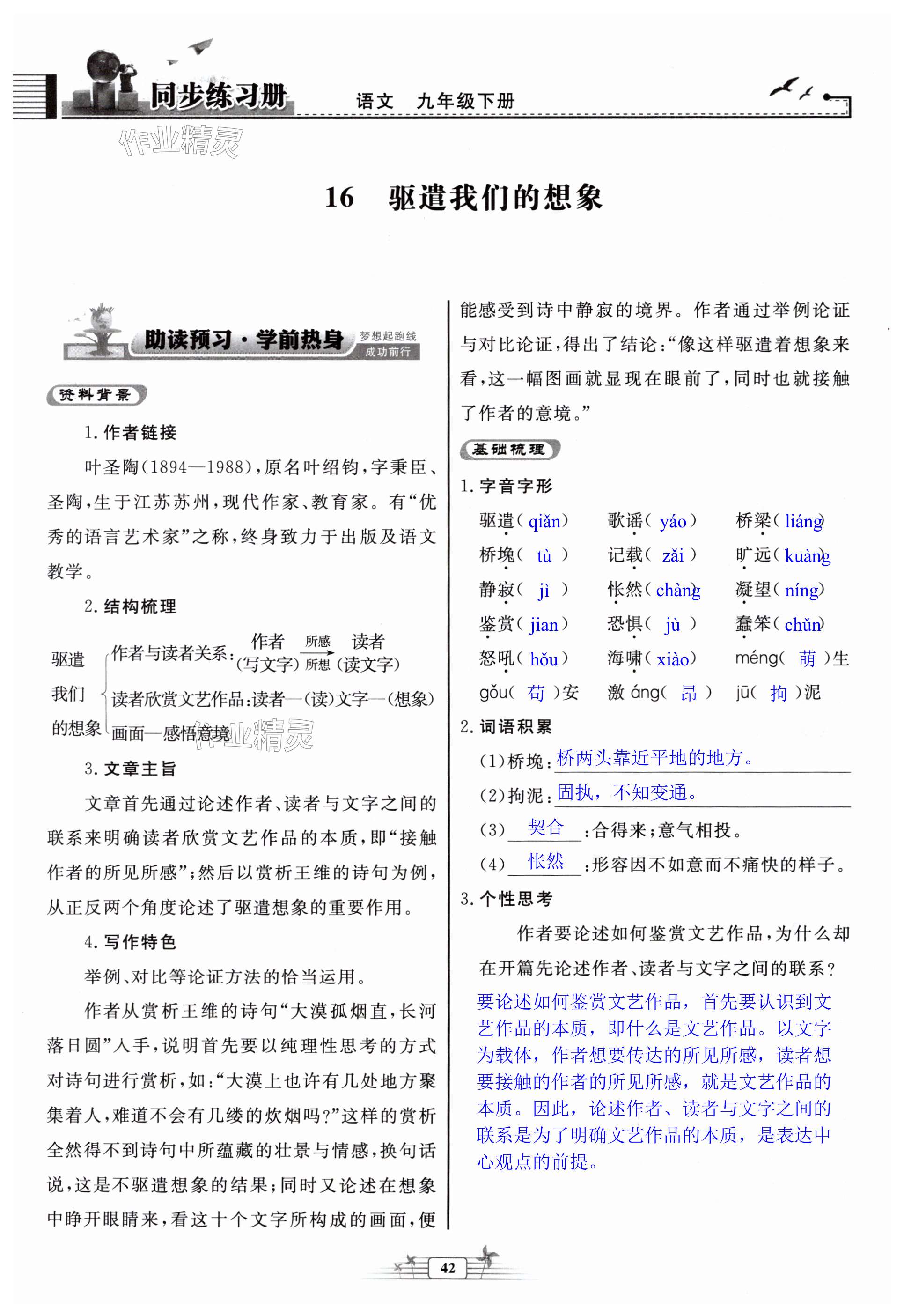 注:目前有些书本章节名称可能整理的还不是很完善,但都是按照顺序排列的,请同学们按照顺序仔细查找。练习册 2025年同步练习册人民教育出版社九年级语文下册人教版江苏专版 答案主要是用来给同学们做完题方便对答案用的,请勿直接抄袭。