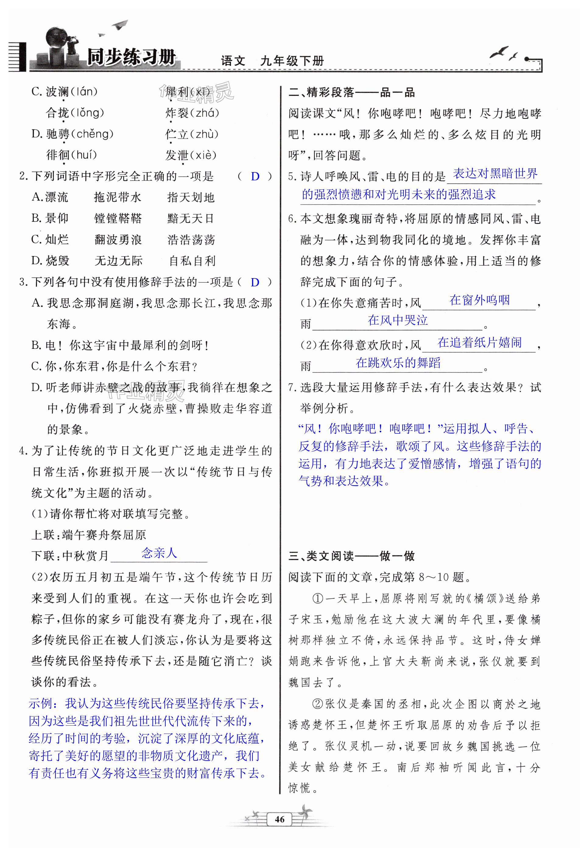 注:目前有些书本章节名称可能整理的还不是很完善,但都是按照顺序排列的,请同学们按照顺序仔细查找。练习册 2025年同步练习册人民教育出版社九年级语文下册人教版江苏专版 答案主要是用来给同学们做完题方便对答案用的,请勿直接抄袭。