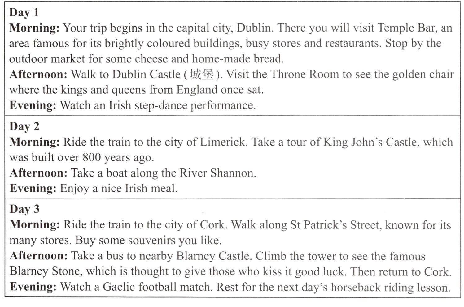 Imagine that you are going on a trip to Ireland. The first three days of your trip are planned below.