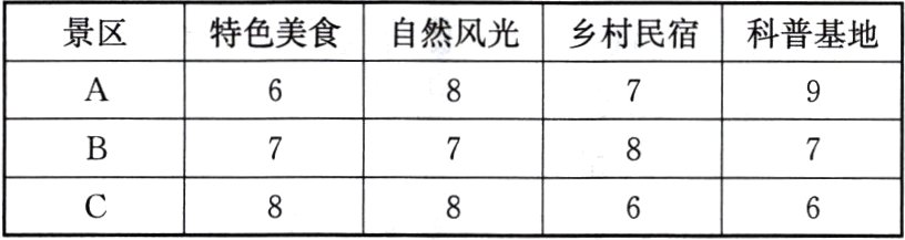 景区C得分为$\frac{8×30\% + 8×15\% + 6×40\% + 6×15\%}{100\%}$ = 6.9(分),