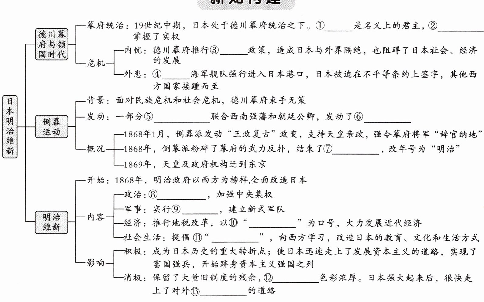 天皇@@幕府将军@@锁国@@美国@@中下级武士@@倒幕运动@@幕府统治@@废藩置县,加强中央集权@@征兵制@@“殖产兴业”@@“文明开化”@@军国主义@@侵略扩张