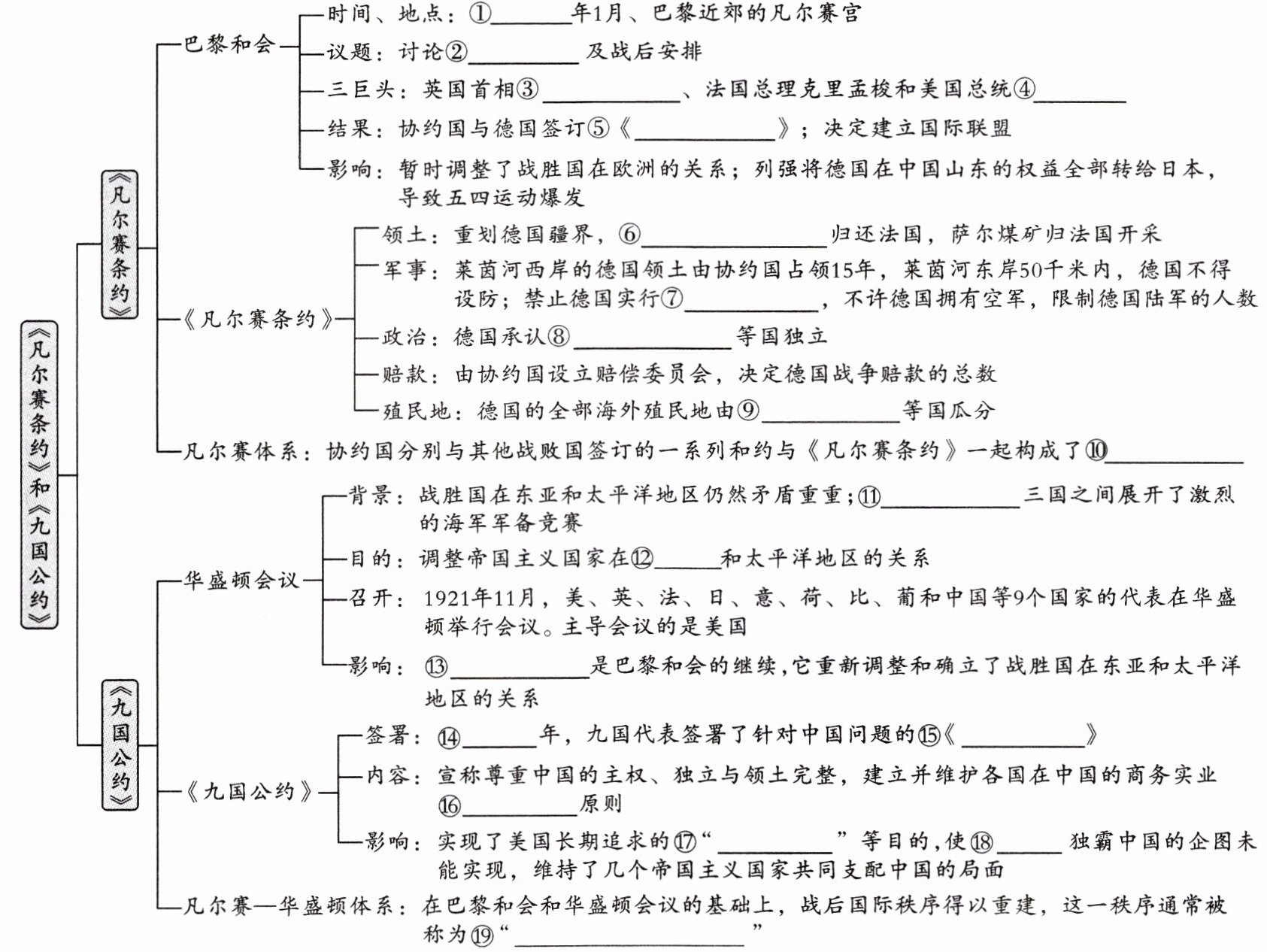 1919@@对德和约@@劳合·乔治@@威尔逊@@凡尔赛条约@@阿尔萨斯—洛林@@义务兵役制@@奥地利、波兰@@英、法、日@@凡尔赛体系@@日、英、美@@东亚@@华盛顿会议@@1922@@九国公约@@机会均等@@门户开放@@日本@@凡尔赛—华盛顿体系