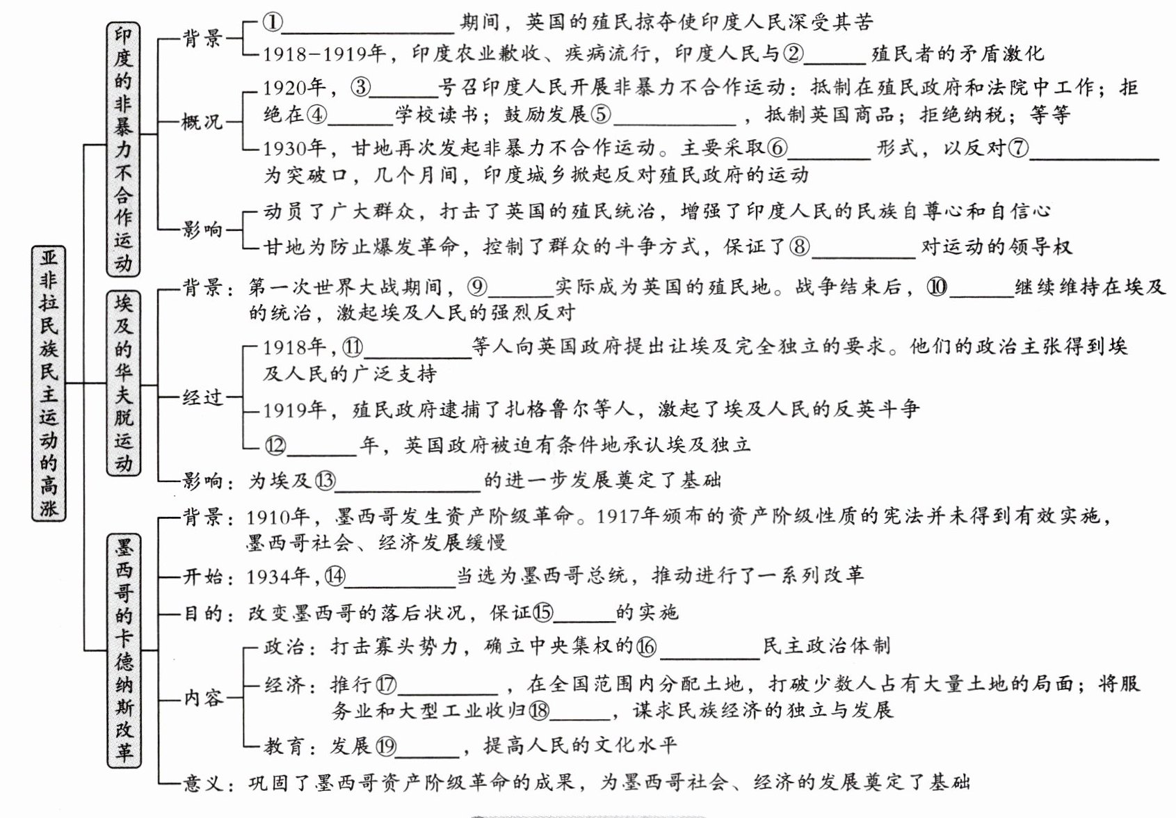 第一次世界大战@@英国@@甘地@@英国@@手工纺织业@@不服从@@食盐专卖法@@资产阶级@@埃及@@英国@@扎格鲁尔@@1922@@民族民主运动@@卡德纳斯@@宪法@@资产阶级@@土地改革@@国有@@教育