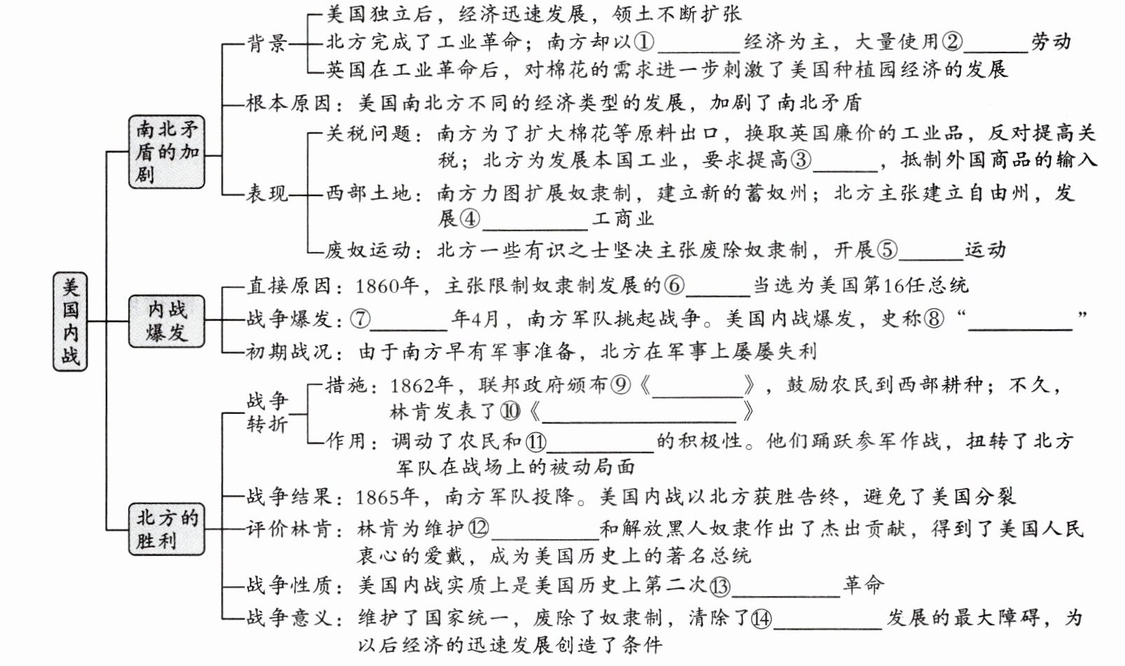种植园@@黑奴@@关税@@资本主义@@废奴@@林肯@@1861@@南北战争@@宅地法@@解放黑人奴隶宣言@@黑人奴隶@@国家统一@@资产阶级@@资本主义