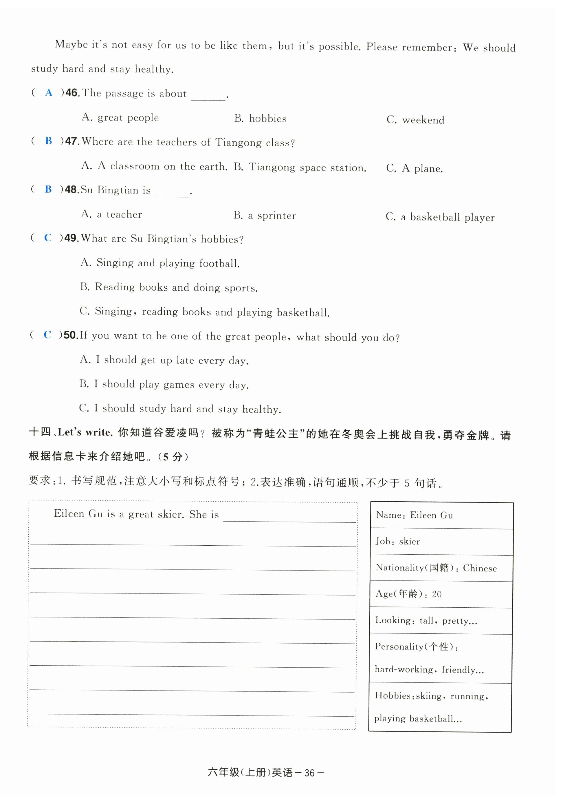 注:目前有些书本章节名称可能整理的还不是很完善,但都是按照顺序排列的,请同学们按照顺序仔细查找。练习册 2024年小学期末加油站六年级英语上册人教版 答案主要是用来给同学们做完题方便对答案用的,请勿直接抄袭。
