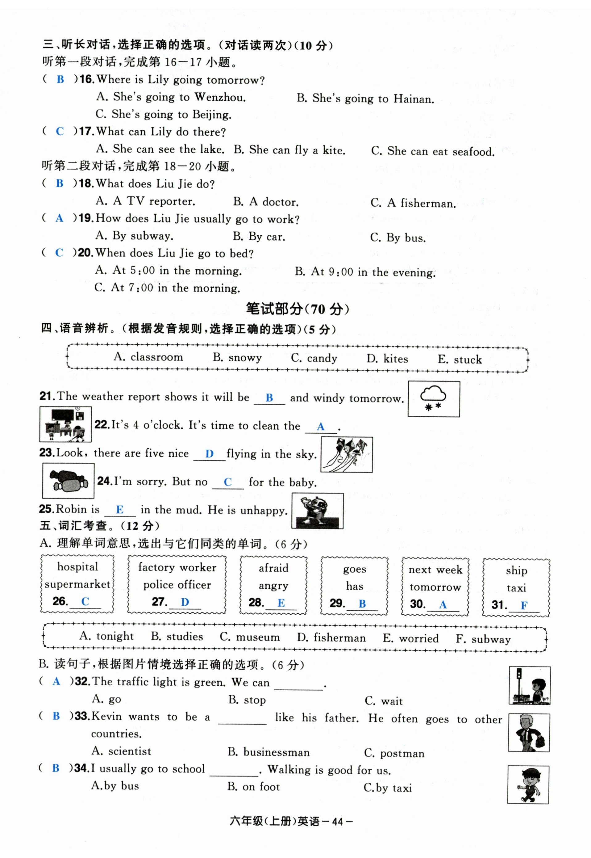 注:目前有些书本章节名称可能整理的还不是很完善,但都是按照顺序排列的,请同学们按照顺序仔细查找。练习册 2024年小学期末加油站六年级英语上册人教版 答案主要是用来给同学们做完题方便对答案用的,请勿直接抄袭。