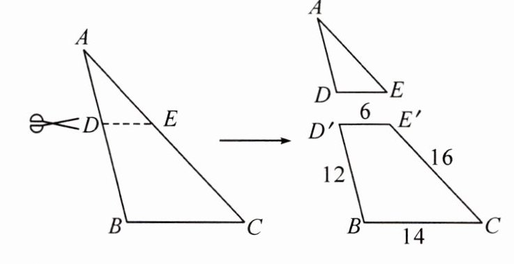 12.如图,将△ABC沿着$DE$剪成一个小三角形$ADE$和一个四边形$D'E'CB$.若$DE// BC$,四边形$D'E'CB$各边的长度如图所示,则剪出的小三角形$ADE$应是( )