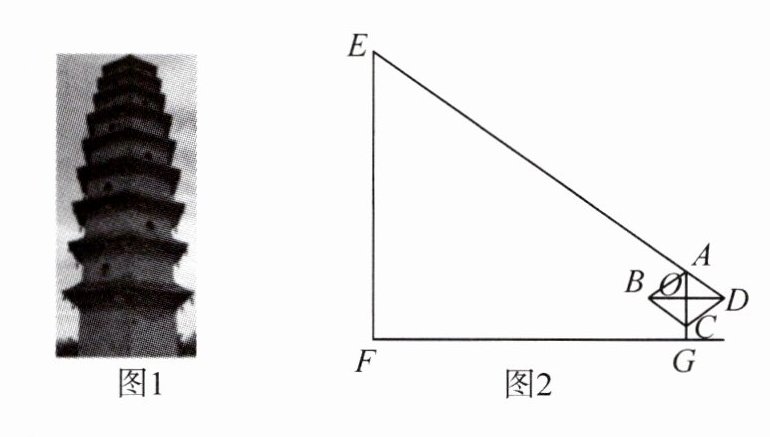 11.(2024·南阳镇平县模拟)如图1所示的是屹立于河南省新郑市南关双洎河南岸的北宋古塔——凤台寺塔,距今已有900余年的历史,为仓颉造字之地.数学综合实践小组用自制的菱形测角仪ABCD测量塔高,其边长为50 cm,较长的对角线DB的长为80 cm,O为对角线的交点,当测角仪的顶点D,A与塔顶避雷装置顶端的点E在同一条直线上时,系在顶点A处的铅垂线AG过点O和顶点C,交地平线FG于点G,经测量得到FG = 26 m,OG = 1.5 m.