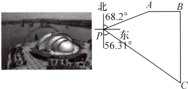 解:过点$P$作$PE\perp BC$于点$E$,过点$A$作$AD\perp PE$于点$D$,则四边形$ADEB$是矩形,$\therefore DE = AB = 520$ m. 设$PD = x$ m,则$PE = PD + DE=(x + 520)$ m. 在$Rt\triangle APD$中,$\because\angle PAD = 68.2^{\circ}$,$\therefore AD=\frac{PD}{\tan68.2^{\circ}}\approx\frac{x}{2.5}=\frac{2}{5}x$ m. $\therefore BE = AD=\frac{2}{5}x$ m. $\therefore CE = BC - BE=(1200-\frac{2}{5}x)$ m. 在$Rt\triangle PCE$中,$\tan C=\tan56.31^{\circ}=\frac{PE}{CE}$,$\therefore\frac{x + 520}{1200-\frac{2}{5}x}\approx1.5$,解得$x = 800$. $\therefore PE = 800 + 520 = 1320$(m). 答:明珠大剧院到龙堤$BC$的距离约为$1320$ m.