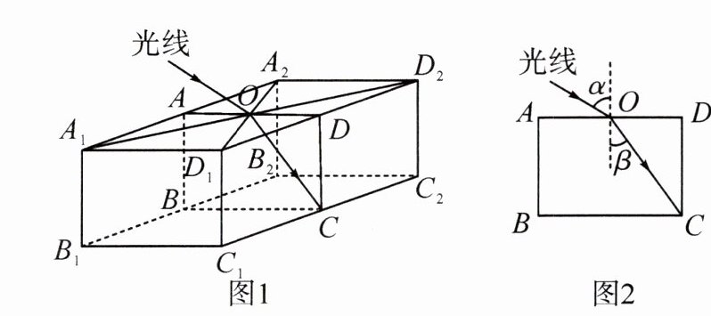 (2)现有一块与(1)中折射率相同的长方体介质,如图1所示,点A,B,C,D分别是长方体棱的中点.若光线经真空从矩形A₁D₁D₂A₂对角线交点O处射入,其折射光线恰好从点C处射出,其平面示意图如图2所示.已知α = 60°,CD = 10 cm,求截面ABCD的面积.