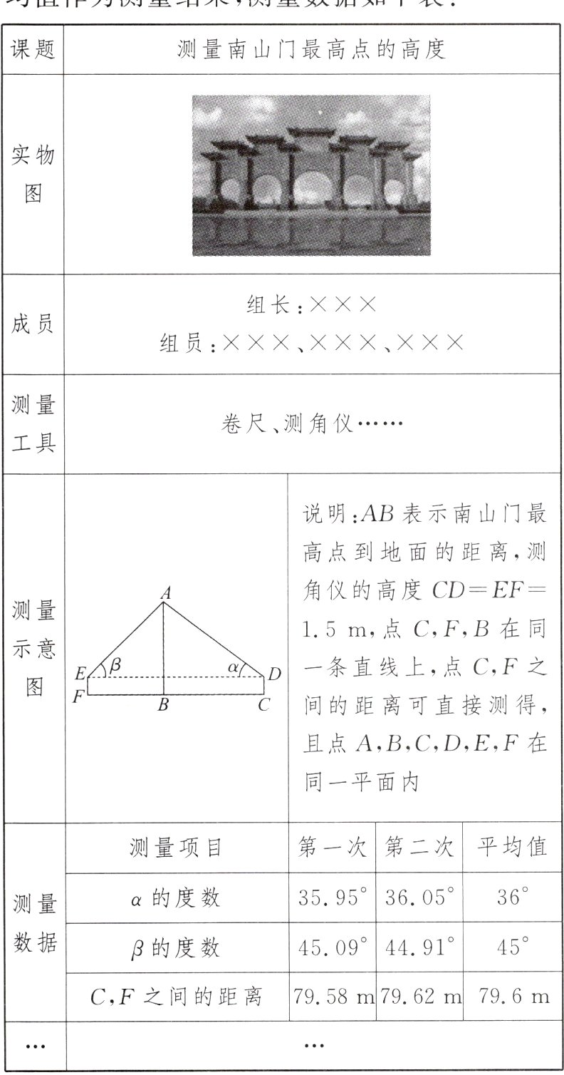 3.蔡明园公园位于河南省驻马店市上蔡县蔡都镇西南部,其公园南山门被誉为“亚洲第一门”,学完了锐角三角函数知识后,某数学“综合与实践”小组的同学把“测量南山门最高点的高度”作为一项课题活动,他们制定了测量方案,并利用课余时间完成了实地测量. 为了减小测量误差,小组在测量仰角以及两点间的距离时,都分别测量了两次并取它们的平均值作为测量结果,测量数据如下表: