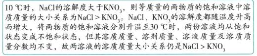 10℃时,NaCl的溶解度大于KNO₃,则等质量的两物质的饱和溶液中溶质质量的大小关系为NaCl > KNO₃。NaCl、KNO₃的溶解度都随温度升高而增大,将两物质的饱和溶液分别升温至30℃时,两份溶液均从饱和状态变成不饱和状态,但其溶质质量、溶剂质量、溶液质量及溶质质量分数均不变,故两溶液的溶质质量大小关系仍是NaCl > KNO₃
