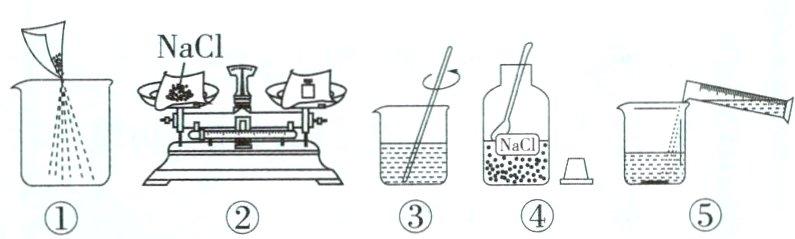 D A(√):用固体溶质配制一定质量分数的溶液的步骤为:计算、称量、溶解、装瓶贴标签,故操作顺序为④②①⑤③,不符合题意。B(√):实验室配制100 g溶质质量分数为16%的氯化钠溶液,则②中需称量NaCl的质量为100 g×16% = 16.0 g,不符合题意。C(√):根据B中的计算,可得需要加入水的质量为100 g - 16 g = 84 g,则需要量取水的体积为84 mL,应选用100 mL量筒量取,不符合题意。D(×):题图①中有部分固体洒落,导致溶解的氯化钠的质量偏小,会造成所配溶液的浓度偏小,符合题意。