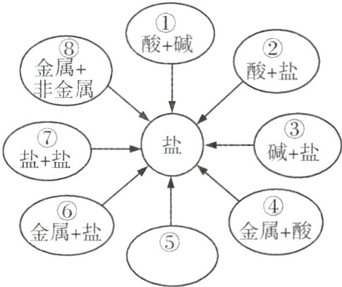 6 学习了单质、氧化物、酸、碱、盐的性质后,发现有很多不同类别的物质在发生反应时都有盐生成(其他物质省略),如图所示。请回答下列问题: