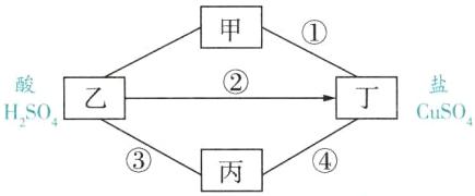 第二步:根据转化关系推断。甲是单质,甲与丁能发生反应,则丁是盐,为硫酸铜,甲为金属单质(活动性比铜强,如铁);乙能转化为硫酸铜,又能与甲反应,则乙是酸,为硫酸;丙能与硫酸反应,还能与硫酸铜反应,则丙为可溶性碱。