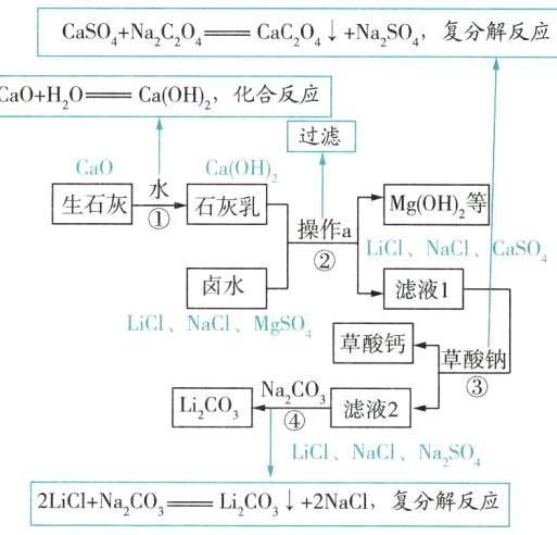 $CaSO_4 + Na_2C_2O_4 \xlongequal{\;\;} CaC_2O_4 \downarrow + Na_2SO_4$,复分解反应;$CaO + H_2O \xlongequal{\;\;} Ca(OH)_2$,化合反应。生石灰加水生成石灰乳,石灰乳与卤水反应,经过操作a过滤,得到$Mg(OH)_2$等沉淀和滤液1($LiCl$、$NaCl$、$CaSO_4$),滤液1中加入草酸钠得到草酸钙,草酸钙再转化为草酸钠,草酸钠与$Li_2CO_3$反应生成$LiCl$、$NaCl$、$Na_2SO_4$,$2LiCl + Na_2CO_3 \xlongequal{\;\;} Li_2CO_3 \downarrow + 2NaCl$,复分解反应。