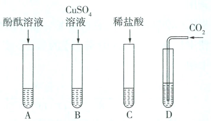 D A(×):氢氧化钠溶液显碱性,试管中氢氧化钠溶液与酚酞溶液混合,溶液变为红色。B(×):氢氧化钠与硫酸铜反应生成氢氧化铜沉淀和硫酸钠,发生反应的化学方程式为2NaOH + CuSO₄ = Cu(OH)₂↓ + Na₂SO₄。C(×):氢氧化钠与盐酸反应生成氯化钠和水,若氢氧化钠过量,滴加酚酞溶液变红,若恰好反应或盐酸过量,则为无色。D(√):氢氧化钠与二氧化碳反应生成碳酸钠和水,碳酸钠与盐酸反应生成氯化钠、水和二氧化碳,向反应后的D试管中加足量稀盐酸,一定有气体产生。