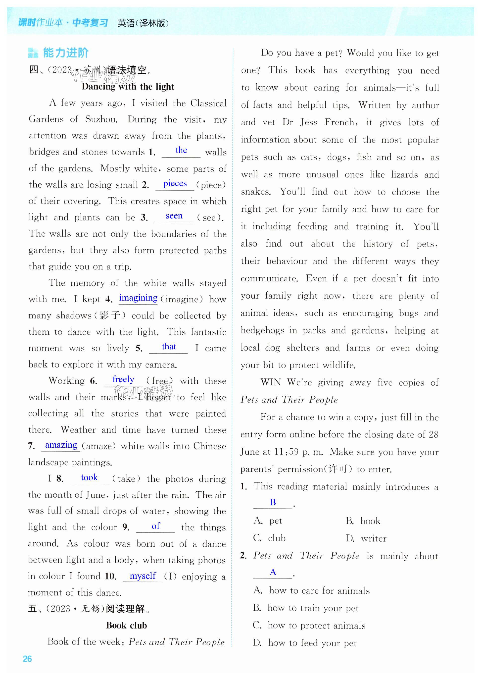 注:目前有些书本章节名称可能整理的还不是很完善,但都是按照顺序排列的,请同学们按照顺序仔细查找。练习册 2025年通城学典课时作业本中考复习英语译林版江苏专版 答案主要是用来给同学们做完题方便对答案用的,请勿直接抄袭。