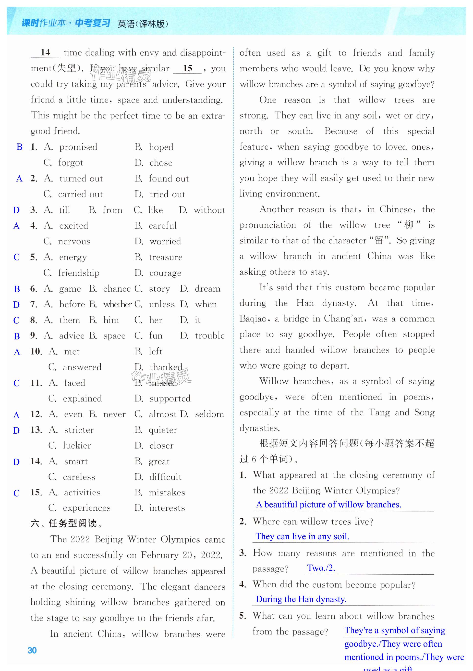 注:目前有些书本章节名称可能整理的还不是很完善,但都是按照顺序排列的,请同学们按照顺序仔细查找。练习册 2025年通城学典课时作业本中考复习英语译林版江苏专版 答案主要是用来给同学们做完题方便对答案用的,请勿直接抄袭。