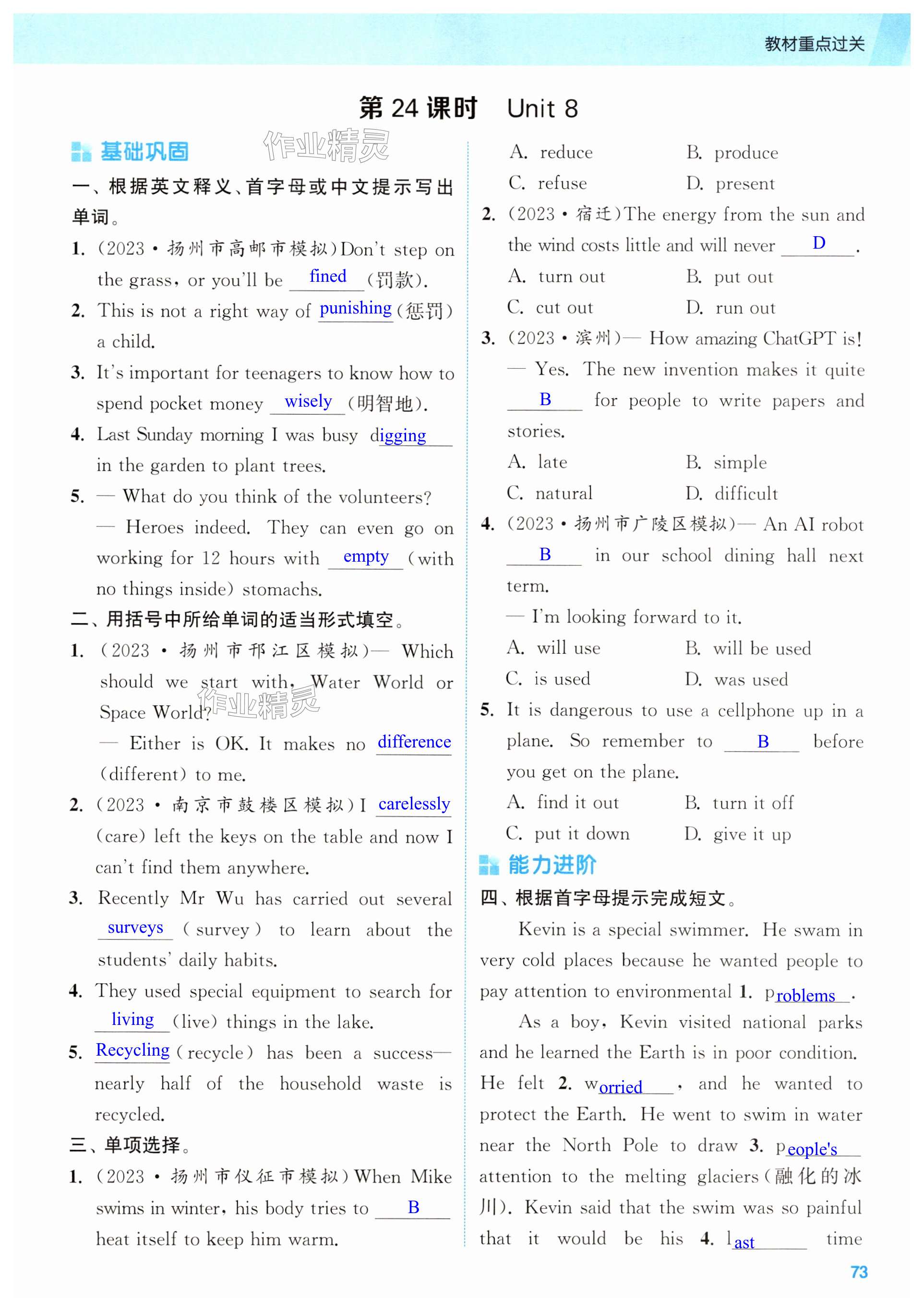 注:目前有些书本章节名称可能整理的还不是很完善,但都是按照顺序排列的,请同学们按照顺序仔细查找。练习册 2025年通城学典课时作业本中考复习英语译林版江苏专版 答案主要是用来给同学们做完题方便对答案用的,请勿直接抄袭。