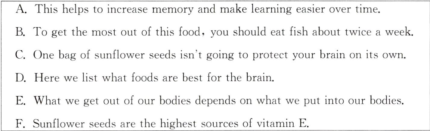 Nuts and seeds offer antioxidants(抗氧化物质)—vitamin E, which helps to protect the brain as you age. 3 Nuts also have a high level of the omega - 3 fatty acid. This not only is good for the brain, but also helps heart health.
