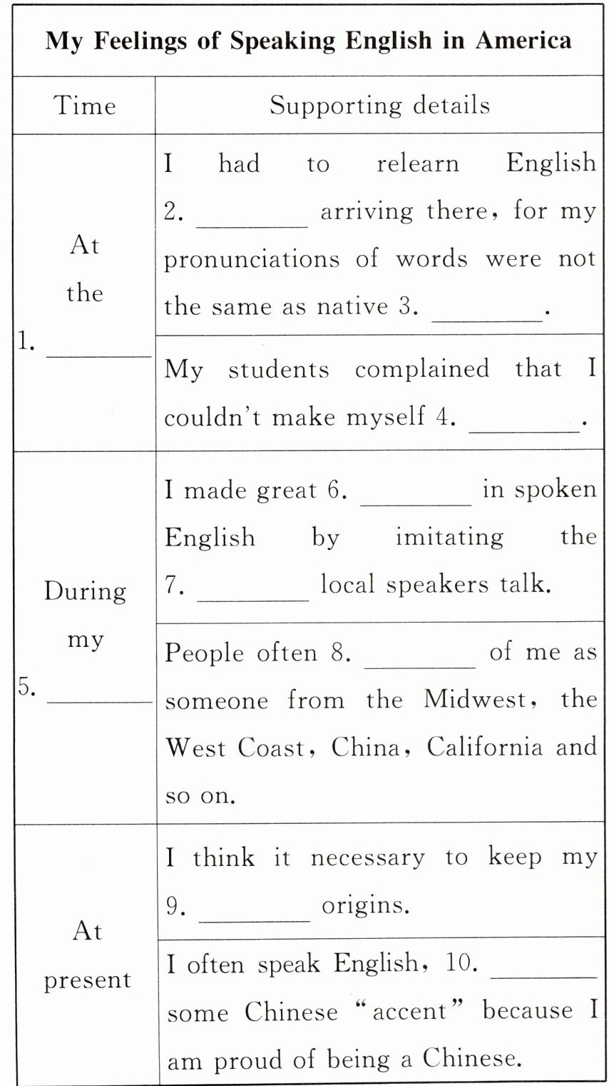 As a fourth - year student in the US,I am no longer a nervous foreigner. My nervousness has been replaced by a wish to hold on to my cultural origins. Now I add some Chinese “accent” on purpose when I speak. I do not wish to speak “perfect” English because I am proud of who I am.