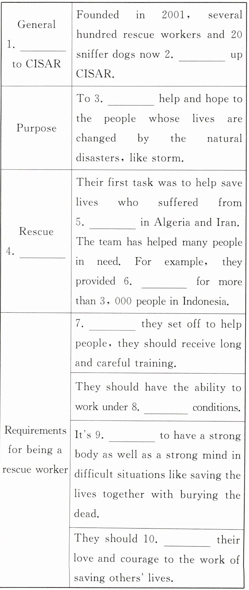 [文章大意]本文是一篇说明文,主要介绍了中国国际搜寻救援队的组成、参与的救援任务以及队员需要具备的素质。