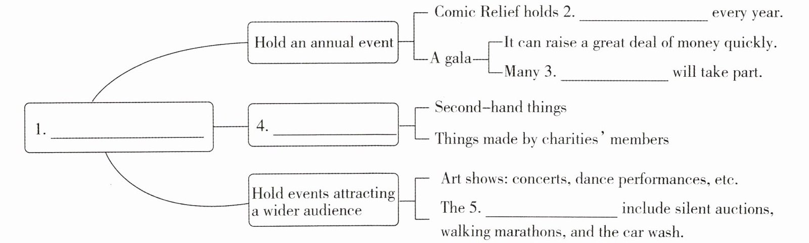 Like Comic Relief, many charities hold an annual event, such as a gala(盛会), to help raise funds. A gala can 3. c_______ much, but it can bring in a great deal of money within a short time. A big gala may include a dinner, speeches, award presentations, and performances, usually 4. g_______ by famous people. And many 5. w_______ donors will come to give money generously.