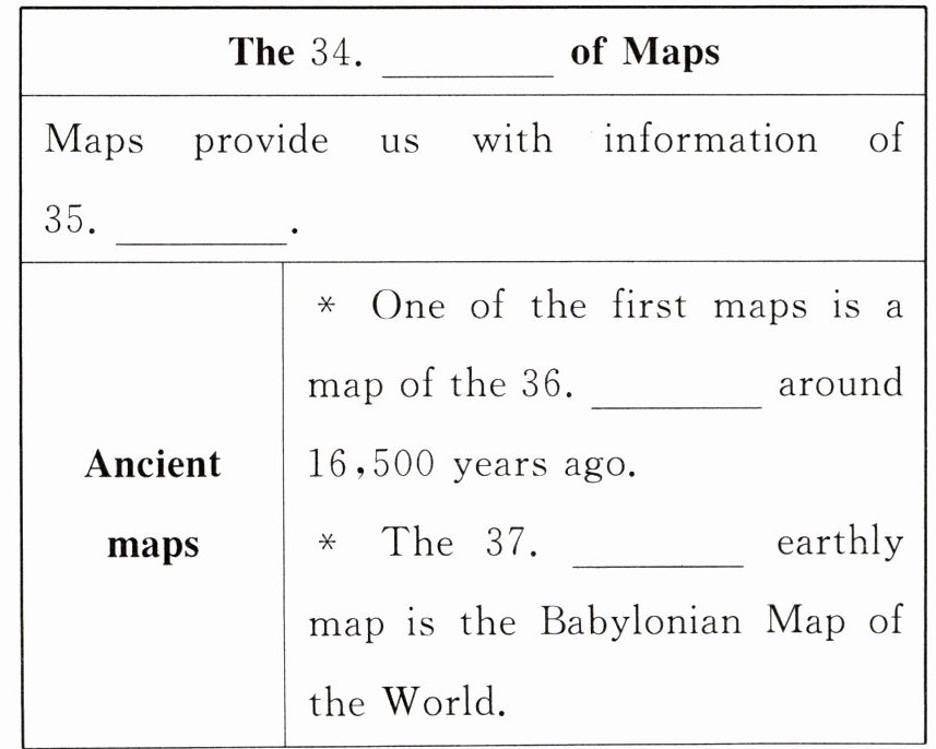 Many ancient countries used maps. One of the first is thought to have been drawn on the wall in Lascaux, France, around 16,500 years ago. Hidden among the drawings of birds and bulls(公牛)is a map of the stars. The Babylonian Map of the World is the oldest known earthly map, which shows Babylon and its neighbouring towns on the stone.