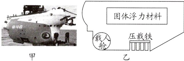 13. (2024·无锡宜兴市期末)中国万米载人深潜器“奋斗者”号曾在马里亚纳海沟成功坐底,深度达10 909 m.图甲是“奋斗者”号,图乙是它的部分结构示意图.“奋斗者”号总质量为20 t,其底部装配有质量为2 t的可抛弃压载铁,中部安装有固体浮力材料,载人舱为空心球体.除载人舱及部分电路设施外,其余部分与海水相通.“奋斗者”号在海水中依靠改变自身重力和受到的海水浮力实现无动力下潜和上浮.忽略深潜器部件受到海水压力后的体积变化.(ρ海水=1.0×10³ kg/m³,g取10 N/kg)