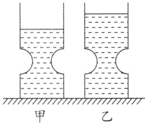 大于 大于 小于 解析:采用割补法,分别把容器两侧半球部分补上同种液体,割补后液体深度不变、密度不变,所以液体对容器底部的压强不变.又因为容器底面积不变,所以液体对容器底部的压力不变.设补上后液体的体积为V,若甲、乙的质量相等,$V_{甲} < V_{乙}$,根据公式$\rho = \frac{m}{V}$可知,甲的密度大于乙的密度.由割补法可知,甲对容器底部的压力$F_{甲} = m_{甲}g + \rho_{甲}gV$,乙对容器底部的压力$F_{乙} = m_{乙}g + \rho_{乙}gV$,$m_{甲} = m_{乙}$,$\rho_{甲} > \rho_{乙}$,所以$F_{甲} > F_{乙}$。又因为容器底面积相同,根据$p = \frac{F}{S}$可知,$p_{甲} > p_{乙}$。若甲和乙对容器底部的压强相等,根据$p = \rho_{液}gh$和$h_{甲} < h_{乙}$,可知$\rho_{甲} > \rho_{乙}$。根据$F = pS$可知,甲、乙对容器底部的压力相等,即$F_{甲} = F_{乙}$,液体对容器底部的压力等于液体受到的重力,即$m_{甲}g + \rho_{甲}gV = m_{乙}g + \rho_{乙}gV$,则$m_{甲} - m_{乙} = (\rho_{乙} - \rho_{甲})V < 0$,故$m_{甲} < m_{乙}$。