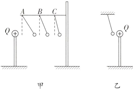 12. 学习了电荷间的相互作用之后,小沈同学大胆地猜想,电荷间相互作用力的大小是否与两电荷所带的电荷量和它们之间的距离有关呢?于是他用如图甲所示装置做起了实验,$Q$是一个带正电的物体,把系在丝线上的带正电的小球先后挂在$A、B、C$三处,比较小球在不同位置所受带电物体的作用力的大小.回答下列问题: