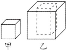 B 解析:正方体乙的密度为${\rho }_{乙}=\frac{{m}_{乙}}{{V}_{乙}}=\frac{6kg}{8\times {10}^{-3}{m}^{3}}=0.75\times {10}^{3}kg/{m}^{3}$,挖去一底面积为$0.01{m}^{2}$、高为$h$的长方体后乙剩下的质量为${m}_{乙剩}={m}_{乙}-{\rho }_{乙}{V}_{乙挖}={m}_{乙}-{\rho }_{乙}Sh$,倒入水的质量为${m}_{水}={\rho }_{水}{V}_{乙挖}={\rho }_{水}Sh$,根据题意有${m}_{乙剩}+{m}_{水}={m}_{甲}$,即${m}_{乙}-{\rho }_{乙}Sh+{\rho }_{水}Sh={m}_{甲}$,代入数据整理可得$6kg-(0.75\times {10}^{3}kg/{m}^{3}-1.0\times {10}^{3}kg/{m}^{3})\times 0.01{m}^{2}\times h=6.3kg$,解得:$h = 0.12m$,故 B 符合题意。