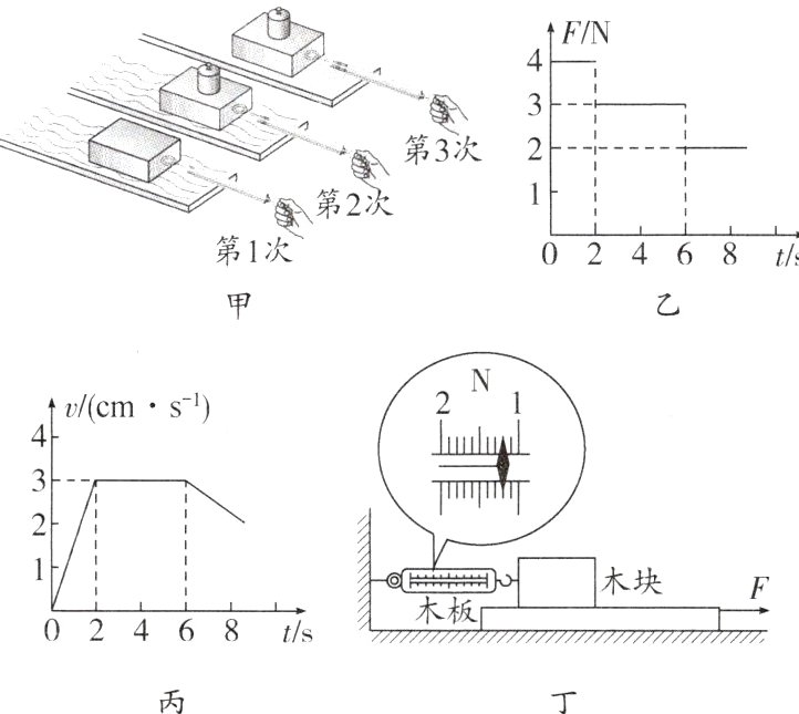 (4)刚开始小强做第1次实验时控制不好力度,拉力随时间变化的图像如图乙所示,木块的速度随时间变化的图像如图丙所示,则木块在第7s时受到的摩擦力为________N.