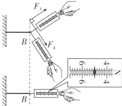 (4)小聪在实验后突发奇想,如果换用两个弹簧测力计相互垂直作用在橡皮筋上拉到B点,记下两弹簧测力计的示数分别为F3 = 3 N、F4 = 4 N;然后只用一个弹簧测力计把橡皮筋也拉到B点,如图所示,读出弹簧测力计的示数F' = ________ N.根据你对合力与分力的理解,判断F'________(填“是”或“不是”)F3、F4的合力.