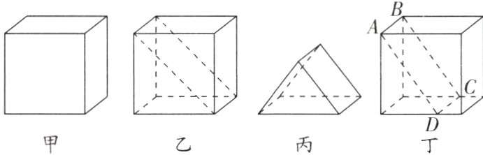11. 如图甲所示,质量均匀分布的实心正方体放在水平地面上,对地面的压强为$p_{0}$. 现按乙方式沿对角线将上半部分切除后,剩余部分对地面的压强$p_{1}=$_______,若将切除部分按图丙方式放置在地面上,对地面的压强$p_{2}$_______$p_{1}$;若该正方体按图丁方式沿ABCD面将右边部分切除,则剩余部分对地面压强$p_{3}$_______$p_{1}$.
