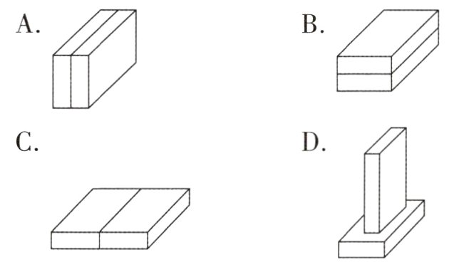 C 解析:由题可知甲组砖对地面的压强为$p_{甲}=\frac{F_{甲}}{S_{甲}}=\frac{G}{S_{甲}}=\frac{G}{4×1}=\frac{G}{4}$.A.两块砖与地面的接触面和甲组相同,根据$p = \rho gh$,和甲组压强相同;B.对地面的压强为$p=\frac{2G}{S_{B}}=\frac{2G}{4×2}=\frac{G}{4}$,和甲组压强相同;C.对地面的压强为$p=\frac{2G}{S_{C}}=\frac{2G}{2×4×2}=\frac{G}{8}$,是甲组压强的一半,故符合题意;D.对地面的压强为$p=\frac{2G}{S_{D}}=\frac{2G}{4×2}=\frac{G}{4}$,和甲组压强相同.故选C.