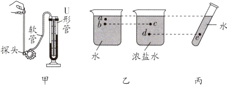 (3)为了探究液体密度对液体内部压强大小的影响,应分别将压强计金属盒的橡皮膜放在图乙烧杯中的_______(填字母)两个位置处进行实验;在a、b、c、d、e五点中压强最大的是_______点.